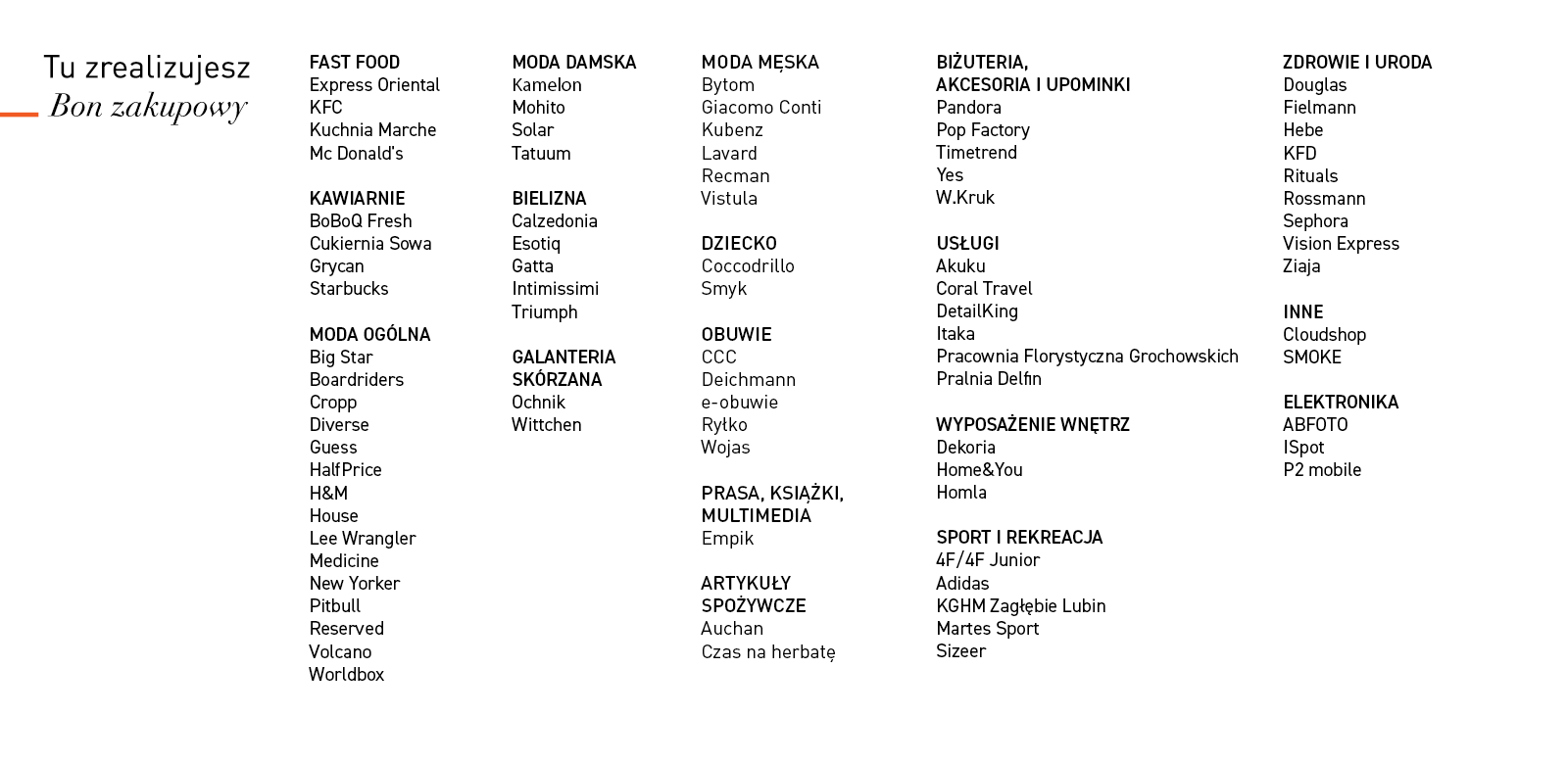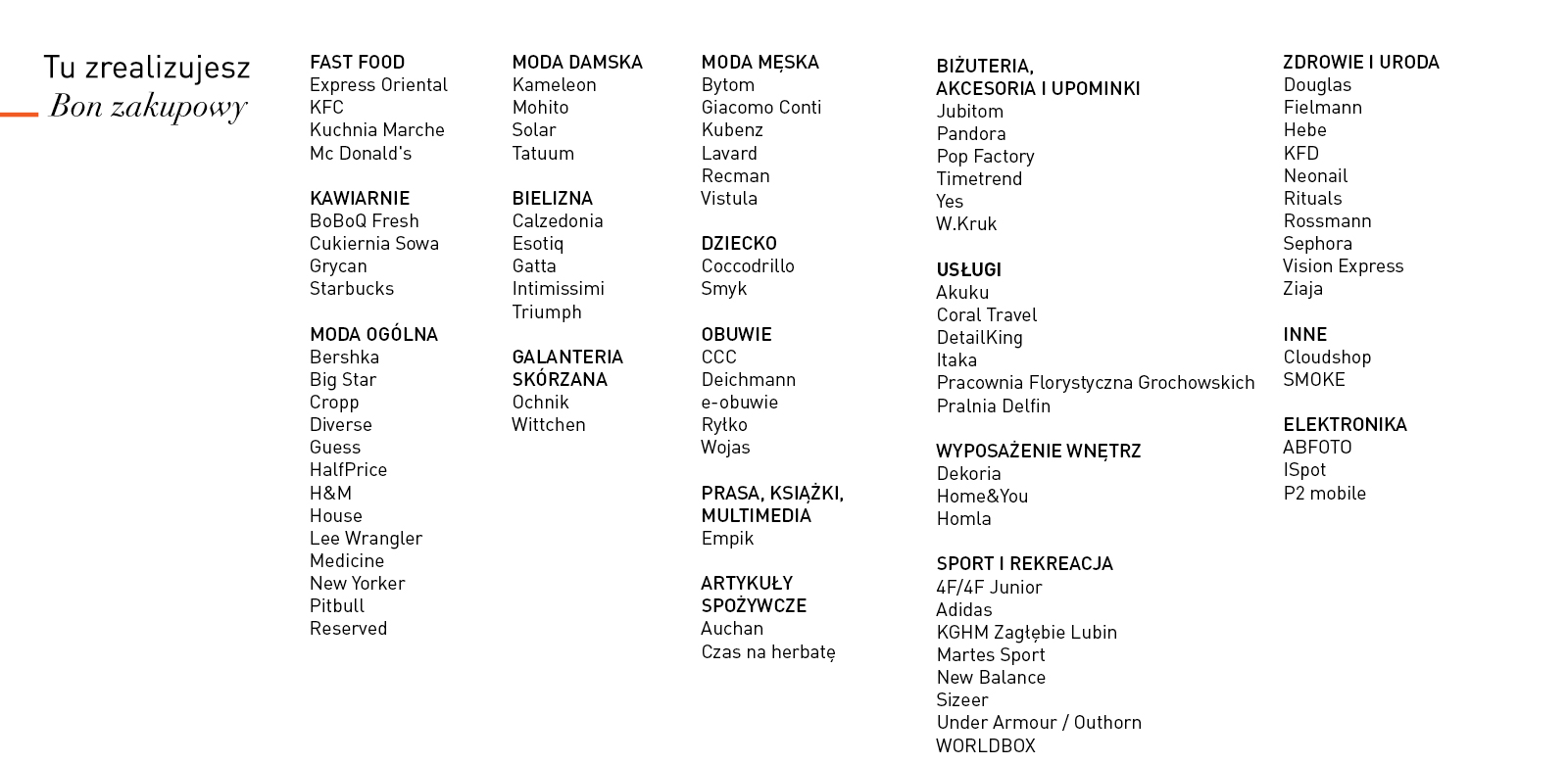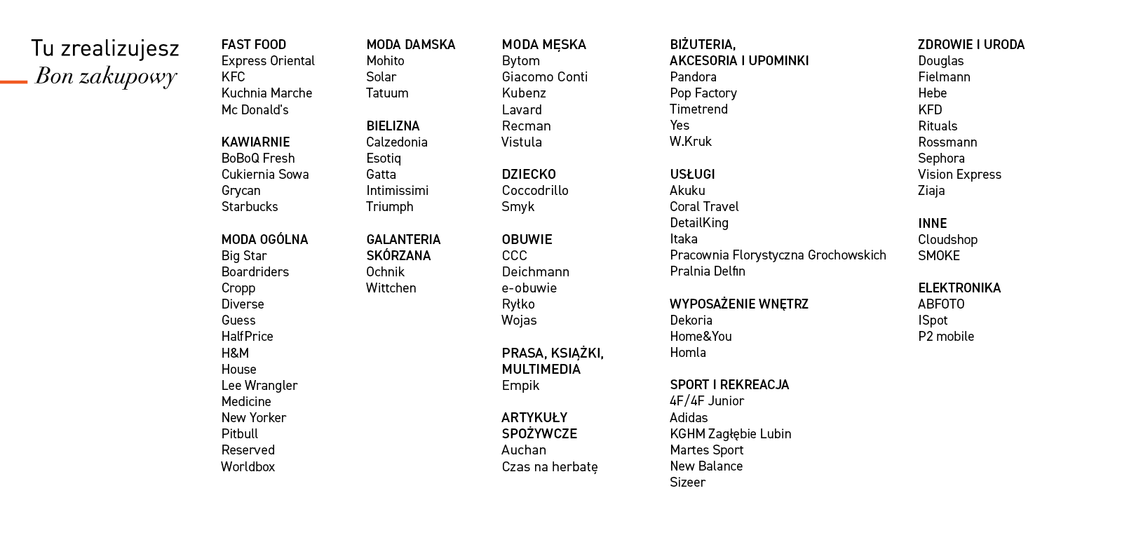 Bony można wykorzystać w 95 sklepach naszego centrum handlowego, dając tym samym obdarowanym możliwość samodzielnego wyboru prezentu spośród tysięcy rzeczy dostępnych na terenie Cuprum Arena.