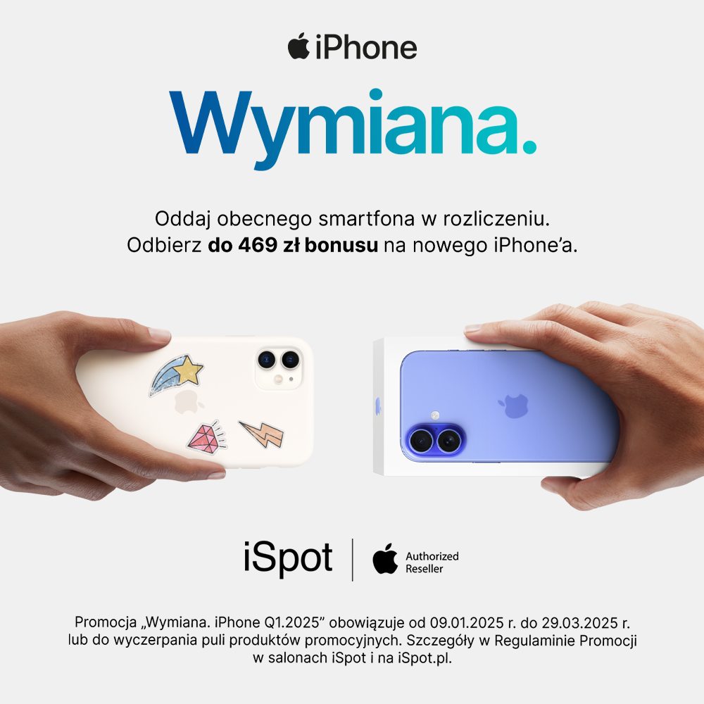 * Bonus od iSpot w wysokości 469 zł przy wymianie na iPhone 16, iPhone 16 Plus, iPhone 16 Pro, iPhone 16 Pro Max lub 246 zł przy wymianie na iPhone 15, iPhone 15 Plus, iPhone 14 lub iPhone 14 Plus.